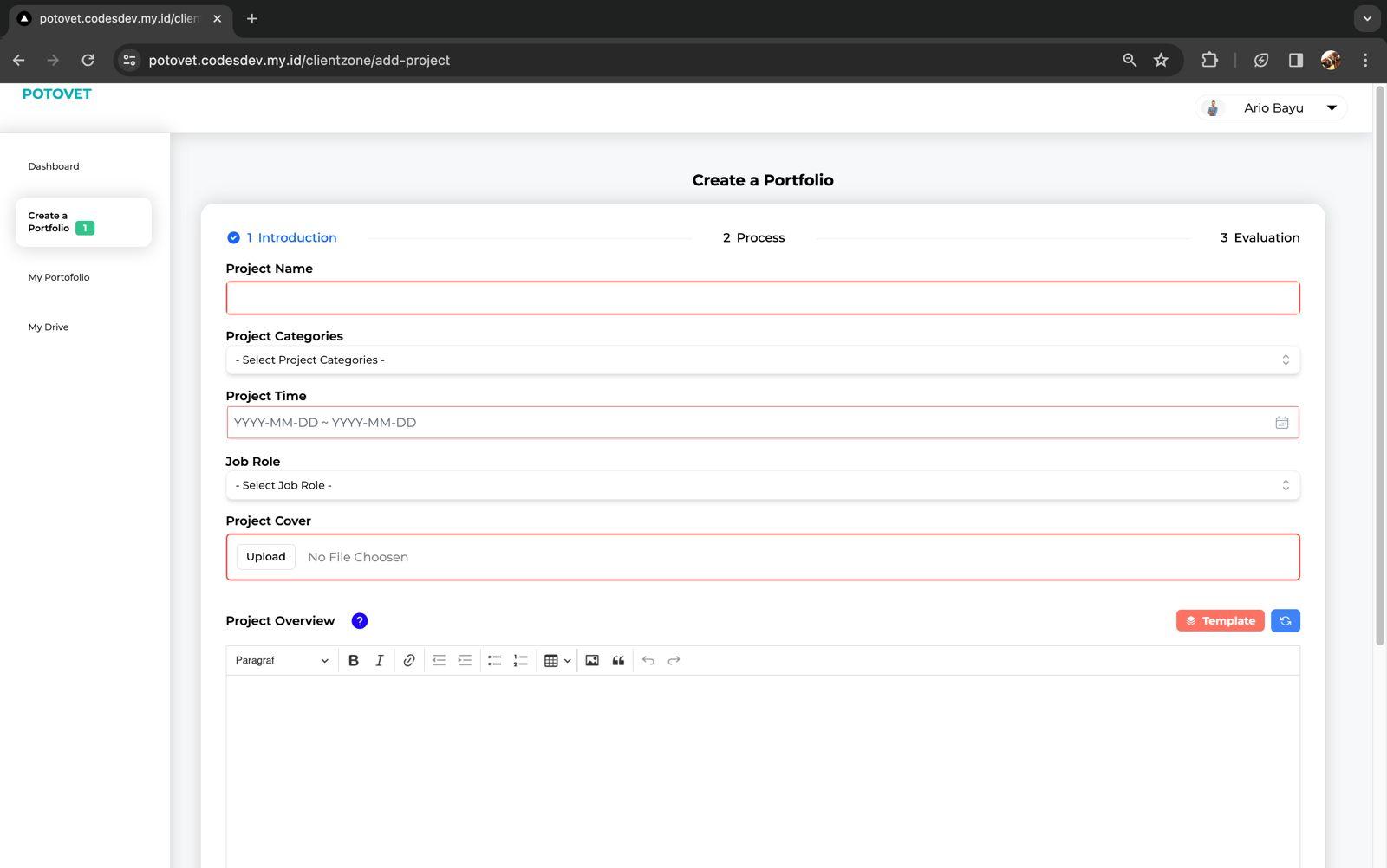 - Pada menu “create a portfolio”, POTOVET akan menyediakan form yang harus kalian isi untuk membuat portfolio. Pembuatan portofolio pada POTOVET terdiri atas 3 (tiga) tahap, yaitu: (1) introduction, (2) process, dan (3) evaluation.