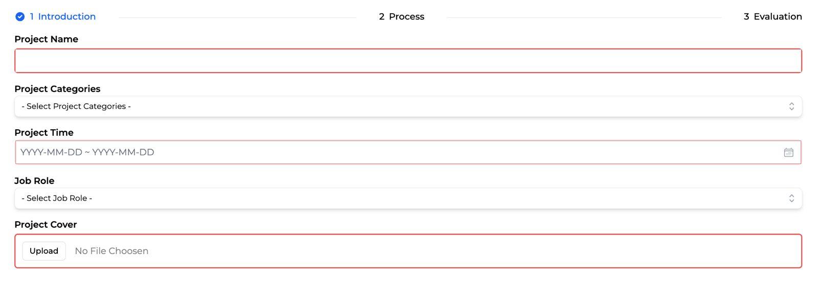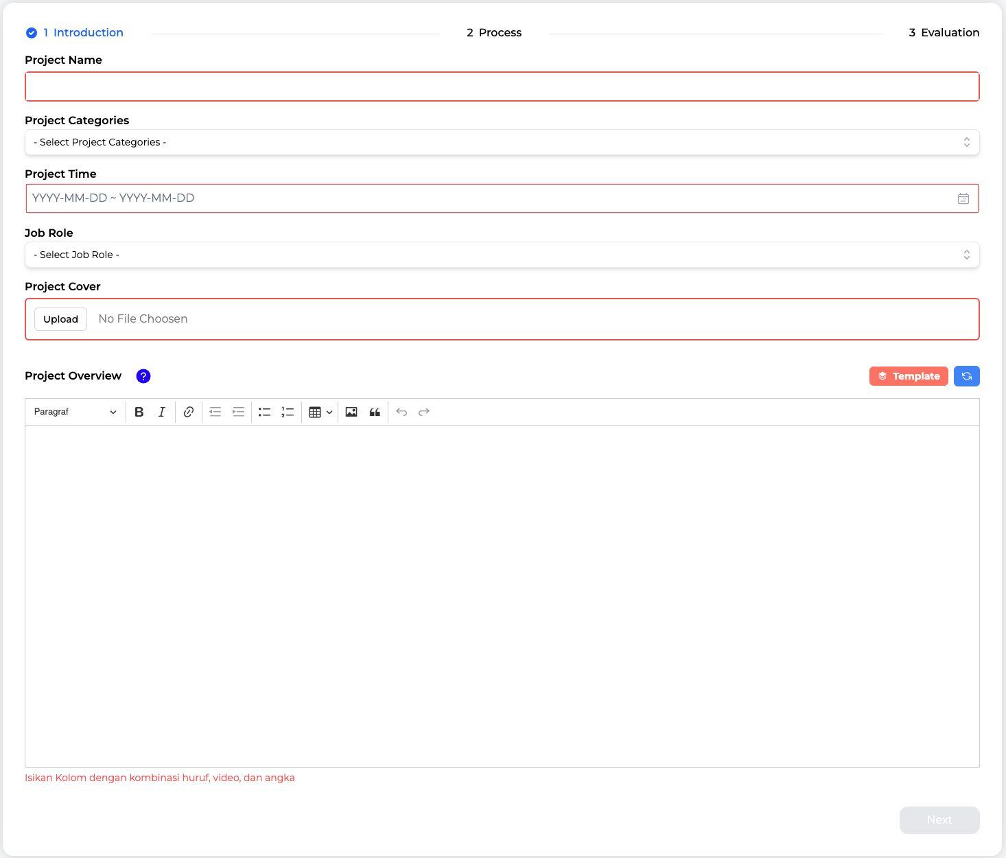 - Setiap form pada masing-masing tahapan akan memandu kalian untuk mengisi data sesuai kebutuhan portofolio. Setiap tahap akan berisi 1 (satu) form dan kalian dapat berpindah menuju tahap selanjutnya dengan menekan button “next”.