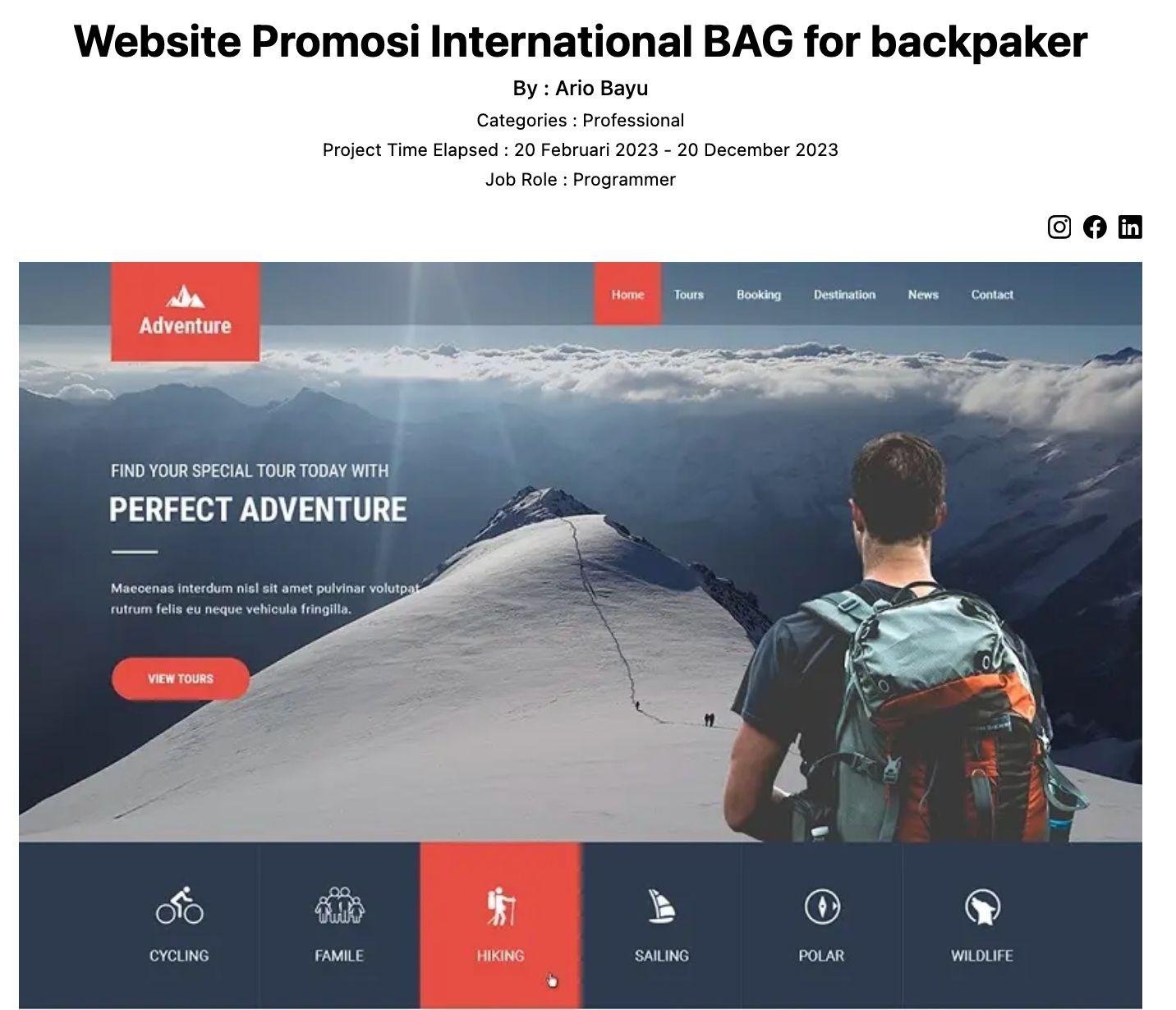 - Introduction : tahap awal dari portofolio yang berisi informasi dasar mengenai proyek. Tahap ini akan menjelaskan informasi pengantar mengenai nama proyek, kategori proyek (dari mana proyek didapat), waktu atau lama pembuatan proyek, posisi dalam proyek, tampilan proyek, tampilan awal proyek, dan narasi proyek berkaitan dengan pengantar pengembangan proyek.